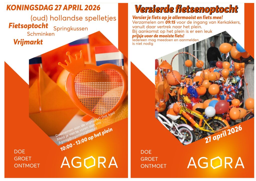Maandag 27 april kleurt Rucphen oranje en vieren we Koningsdag op het plein voor Agora. Haal je mooiste oranje outfit uit de kast, versier je fiets, step, skelter buggy enz.., geef je op voor de vrijmarkt en kom naar Agora dan maken we er een gezellige dag van.