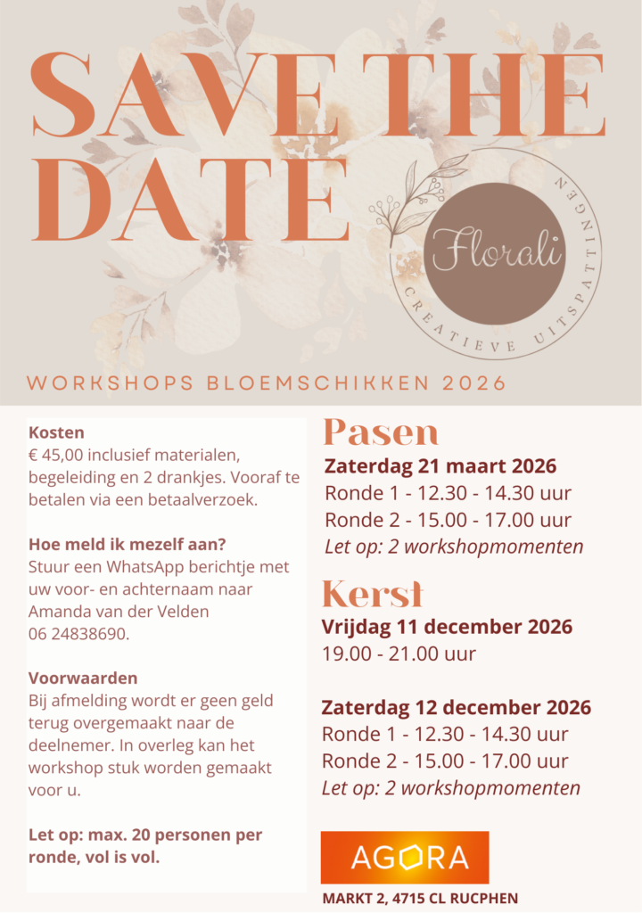 Er staan 5 workshops op het program met de thema’s Pasen en Kerst. Geef jezelf op door een berichtje te sturen naar Amanda en verras jezelf en familie met jouw bloemschikkunsten.